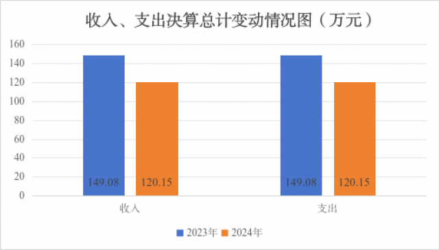 2024年度收入、支出总计均为120.15万元。与2023年度相比,收入、支出总计各减少28.93万元,下降19.41%。主要变动原因是2023年增加了指挥通信系统运行维护资金,2024年减少了这一部分资金。