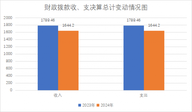 2024年度财政拨款收、支总计均为1644.2万元。与2023年度相比,财政拨款收、支总计各减少145.26万元,减少8.1%。主要变动原因是学生人数和教师人数减少。