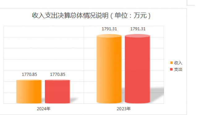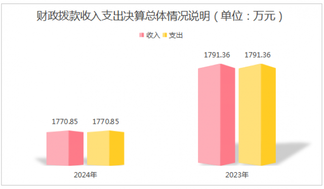 2024年度收、支总计均为1770.85万元。与2023年度相比,收、支总计各减少20.46万元,下降11%。主要变动原因是人员退休调出减少开支。