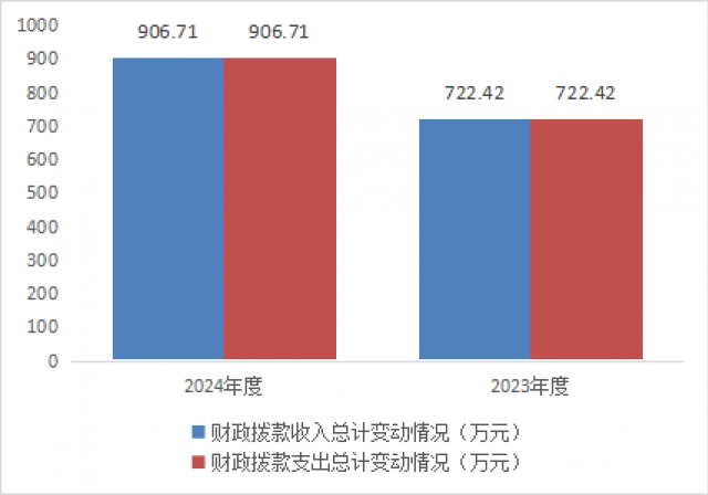 2024年度财政拨款收、支总计均为906.71万元。与2023年度相比,财政拨款收、支总计各增加184.29万元,增长25.51%。主要变动原因是新增运动场维修改造项目。