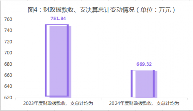 2024年度财政拨款收入、支出总计均为669.32万元。与2023年度相比,财政拨款收入总计、支出总计各减少82.02万元,减少12.25%。主要变动原因是学生自然流失,经费减少,教师人数减少。