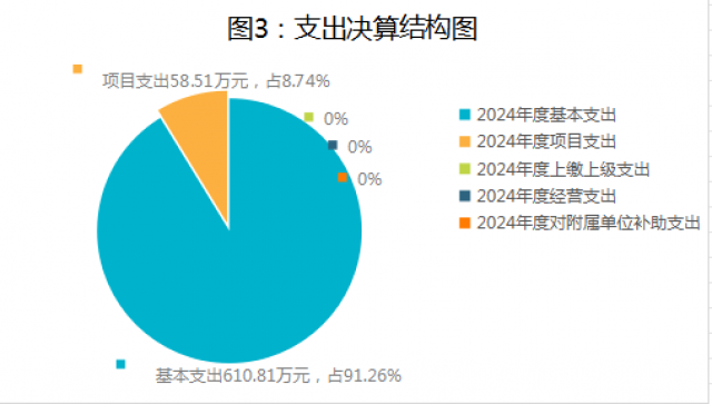 2024年度本年支出合计669.32万元,其中:基本支出610.81万元,占91.26%;项目支出58.51万元,占8.74%;上缴上级支出0万元,占0%;经营支出0万元,占0%;对附属单位补助支出0万元,占0%。
