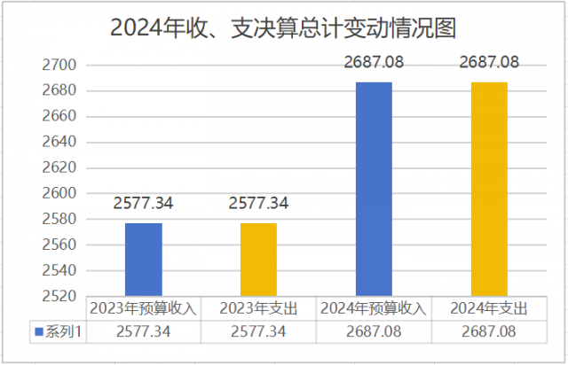 2024年度收、支总计均为2687.08万元。2023年收、支2577.34万元,与2023年度相比,与2023年度相比,收、支总计各增加109.75万元,增加4.26%。主要变动原因2024年项目建设经费支出增加。