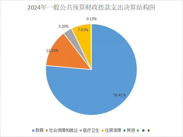 2024年一般公共预算财政拨款支出1173.58万元,主要用于以下方面:一般公共服务支出0万元,占0%;教育支出896.79万元,占76.41%;科学技术支出0万元,占0%;社会保障和就业支出155.22万元,占13.23%;医疗卫生支出37.61万元,占3.2%;住房保障支出82.46万元,占7.03%;其他支出1.5万元,占0.13%。