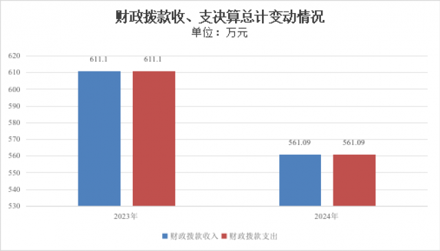 2024年度财政拨款收入、支出总计均为561.09万元。与2023年度相比,财政拨款收入总计、支出总计各减少50.01万元,下降8.18%。主要变动原因是在职人员减少以及项目支出减少。