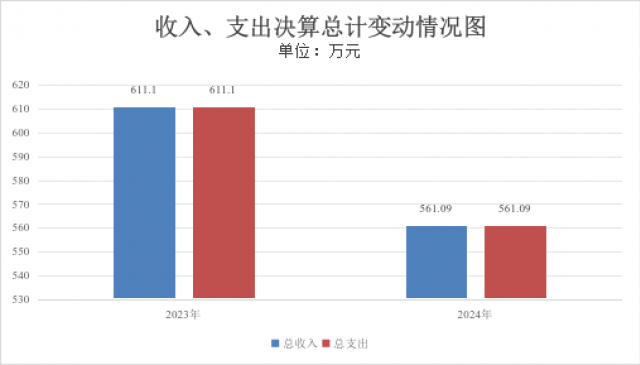 2024年度收入、支出总计均为561.09万元。与2023年度相比,收入、支出总计各减少50.01万元,下降8.18%。主要变动原因是在职人员减少以及项目支出减少。