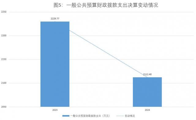 2024年度一般公共预算财政拨款支出2112.40万元,占本年支出合计的99.93%。与2023年度相比,一般公共预算财政拨款支出减少117.37万元,下降5.26%。主要变动原因是教师数减少,学生数减少。