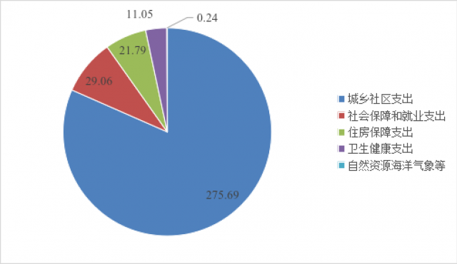 2024年度一般公共预算财政拨款支出337.83万元,主要用于以下方面:城乡社区支出275.69万元,占比81.61%;社会保障和就业支出29.06万元,占8.6%;卫生健康支出11.05万元,占3.27%;住房保障支出21.79万元,占6.45%;自然资源海洋气象等支出0.24万元,占0.07%。(图6)