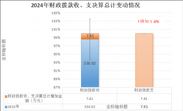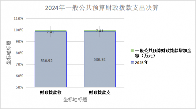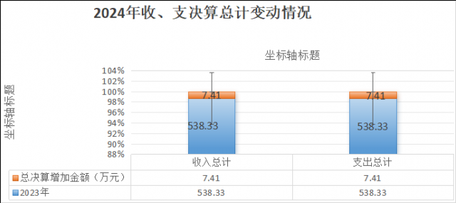 2024年度收、支总计538.33万元。与2023年相比,收、支总计增加了7.4万元,增加了1.4%。主要变动原因是项目支出减少19.88万元,基本支出增加27.28万元。