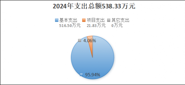 2024年本年支出合计538.33万元,其中:基本支出516.5万元,占95.94%;项目支出21.83万元,占4.06%;上缴上级支出0万元,占0%;经营支出0万元,占0%;对附属单位补助支出0万元,占0%。(注:数据来源于财决05表,仅罗列本单位涉及的支出。)