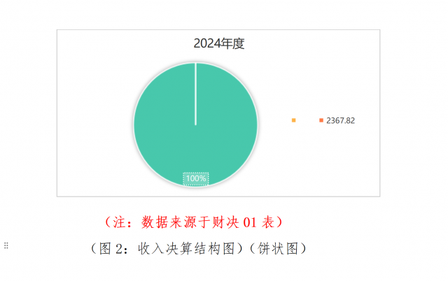 2024年度本年收入合计2367.82万元,其中:一般公共预算财政拨款收入2367.82万元,占100%;政府性基金预算财政拨款收入0万元,占0%;国有资本经营预算财政拨款收入0万元,占0%;上级补助收入0万元,占0%;事业收入0万元,占0%;经营收入0万元,占0%;附属单位上缴收入0万元,占0%;其他收入0万元,占0%。