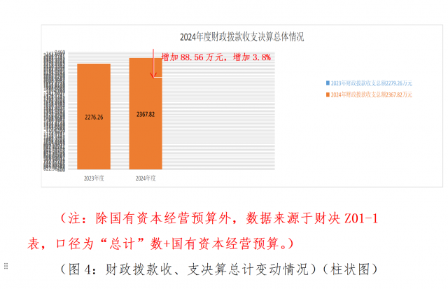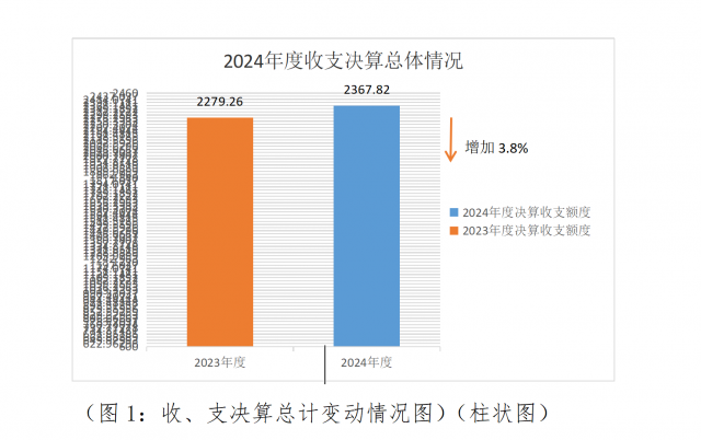 2024年度收、支总计均为2367.82万元。与2023年度相比,收、支总计各增加88.56万元,增长3.8%。主要变动原因是政府加大对教育经费的投入。