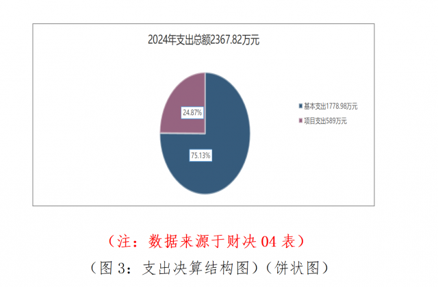 2024年度本年支出合计2367.82万元,其中:基本支出1778.98万元,占75%;项目支出589万元,占25%;上缴上级支出0万元,占0%;经营支出0万元,占0%;对附属单位补助支出0万元,占0%。