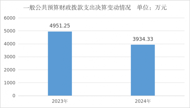 2024年度一般公共预算财政拨款支出3934.33万元,占本年支出合计的100%。与2023年度相比,一般公共预算财政拨款支出减少1856.71万元,下降20.54%。主要变动原因是部门及下属单位厉行节约,缩减经费。