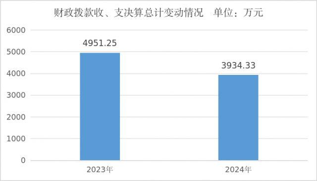 2024年度财政拨款收入、支出总计均为3934.33万元。与2023年度相比,财政拨款收入总计、支出总计各减少1856.71万元,下降20.54%。主要变动原因是部门及下属单位厉行节约,缩减经费。