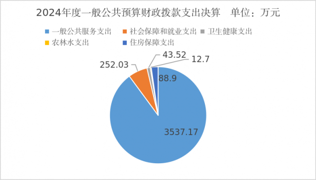 2024年度一般公共预算财政拨款支出3934.33万元,主要用于以下方面:一般公共服务支出3537.17万元,占89.91%;社会保障和就业支出252.03万元,占6.41%;卫生健康支出43.52万元,占1.11%;农林水支出12.7万元,占0.3%;住房保障支出88.9万元,占2.27%