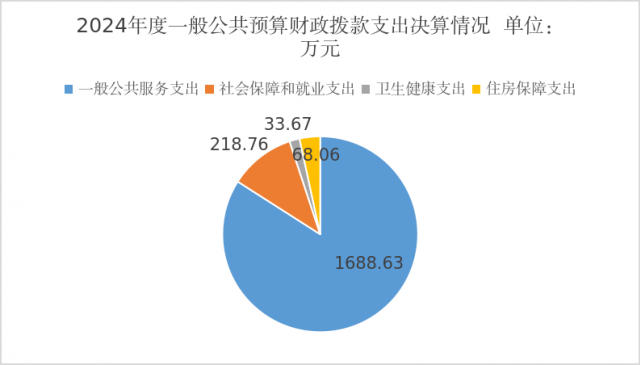 2024年度一般公共预算财政拨款支出2009.11万元,主要用于以下方面:一般公共服务支出1688.63万元,占84.05%;社会保障和就业支出218.76万元,占10.89%;卫生健康支出33.67万元,占1.67%;住房保障支出68.06万元,占3.39%