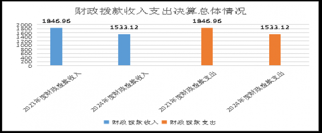 2024年度财政拨款收入总计1533.12万元,支出决算总计1533.12万元,收支平持平。与2023年度财政拨款收、支决算总计1846.96万元相比,财政拨款收、支总计各减少277.27万元,减少16.9%。