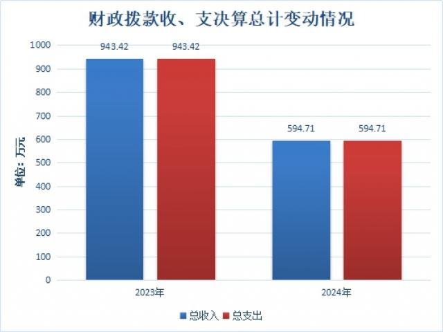 2024年度财政拨款收、支总计594.71万元。财政拨款收入、支出总计与2023年度相比,各减少348.71万元,下降37%,收入变动减少主要变动原因是2023年度医疗服务能力提升资金及中医(民族医)药专项资金划拨到位,2024年度无此类相关资金收入,支出变动减少主要原因是2023年度为提升医疗服务能力购买设备及科室打造的卫生健康支出及中医馆打造的项目支出,2024年度无此类相关资金支出。