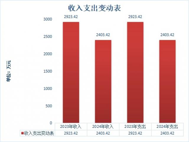 2024年度收、支总计均为2403.42万元。与2023年度相比,收入总计减少520万元,下降17.8%,收入减少主要变动原因是2024年度医疗收入大幅度降低,支出总计减少520万元,下降17.8%,主要变动原因是社会保障和就业支出及卫生健康支出减少。