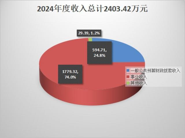 2024年度本年收入合计2403.42万元,其中:一般公共预算财政拨款收入594.71万元,占24.8%;事业收入1779.32万元,占74%;其他收入29.39万元,占1.2%。