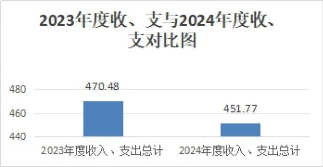 2024年度收入、支出总计均为451.77万元。与2023年比,收入、支出总计各减少18.71万元,下降4.1%。主要变动原因是公共卫生服务人口减少及业务收入减少,致今年收支较往年减少,总收入相应减少。