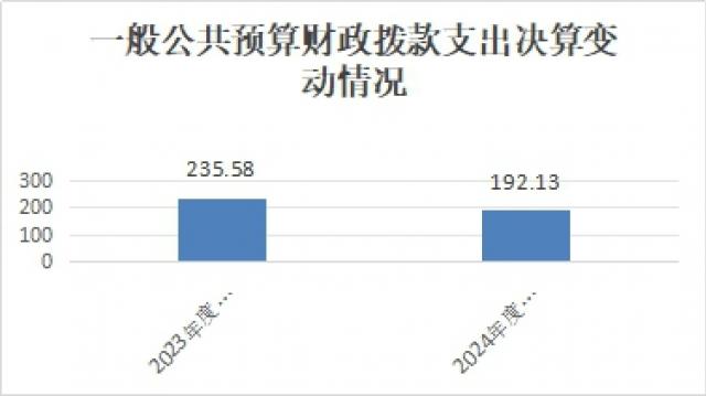 2024年度一般公共预算财政拨款支出192.13万元,占本年支出合计的42.5%。与2023年度相比,一般公共预算财政拨款支出减少43.45万元,下降22.6%。主要变动原因是因今年没有及时到财政划拨资金,致今年收支较往年减少,总收入相应减少。