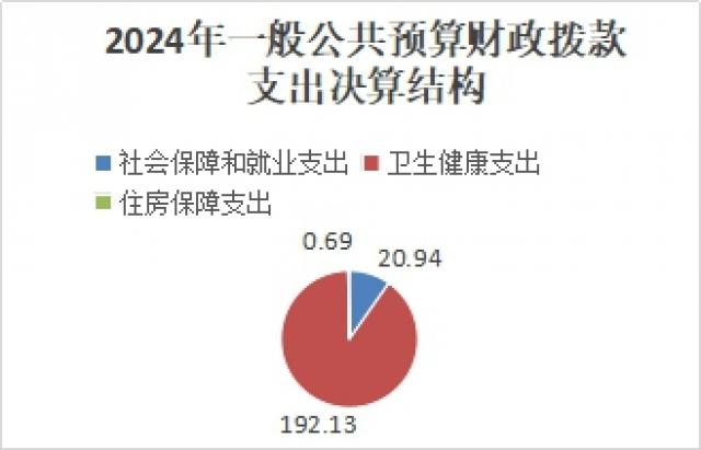 2024年度一般公共预算财政拨款支出192.13万元,主要用于以下方面:社会保障和就业支出20.94万元,占10.9%;卫生健康支出170.5万元,占88.7%;住房保障支出0.69万元,占0.7%。