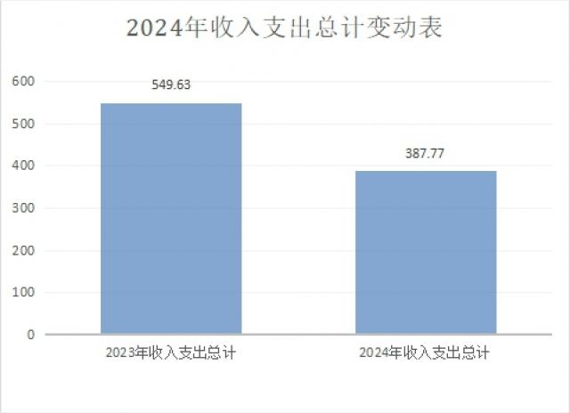 2024年度支出总计为387.77万元。与2023年度相比,收入总计减少161.86万元,下降29.5%。主要变动原因是基本公共卫生服务人员减少及医疗费用下降,医疗成本支出减少。