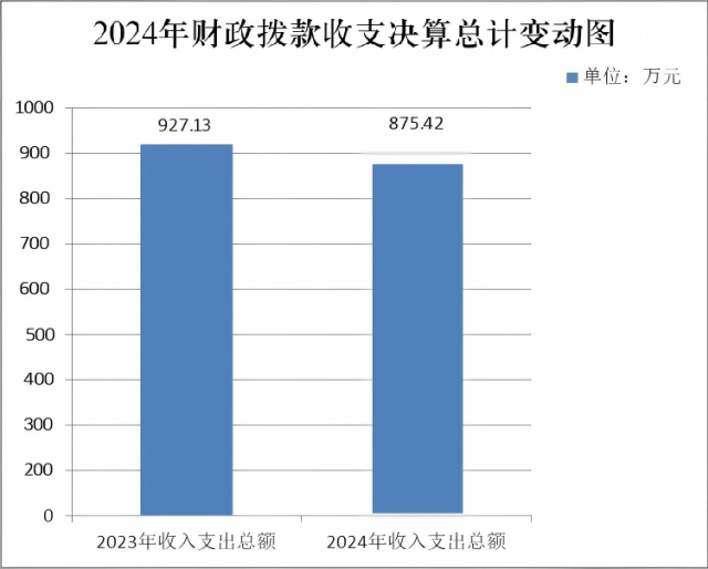 2024年度财政拨款收入、支出总计均为875.42万元。与2023年度相比,财政拨款收入总计、支出总计各减少51.89万元,下降5.9%。主要变动原因是职工人数减少导致人员经费支出相应减少。