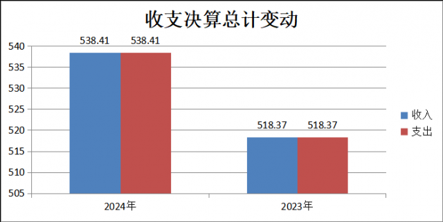 2024年度收、支总计均为538.41万元。与2023年度相比,收、支总计各增加20.04万元,上升3.72%。主要变动原因是2024年财政拨款增加。
