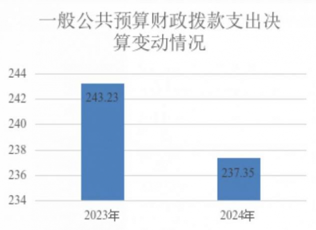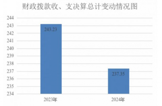 2024年度财政拨款收入、支出总计为237.35万元。与2023年度相比,财政拨款收入总计、支出总计各减少5.88万元,下降2.48%。主要变动原因是在职人员减少一人。