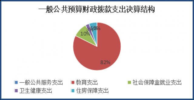 2024年度一般公共预算财政拨款支出4326.53万元,主要用于以下方面:一般公共服务支出0万元,占0%;教育支出3563.60万元,占82.37%;社会保障和就业支出421.07万元,占9.73%;卫生健康支出109.14万元,占2.52%;住房保障支出232.72万元,占5.38%。