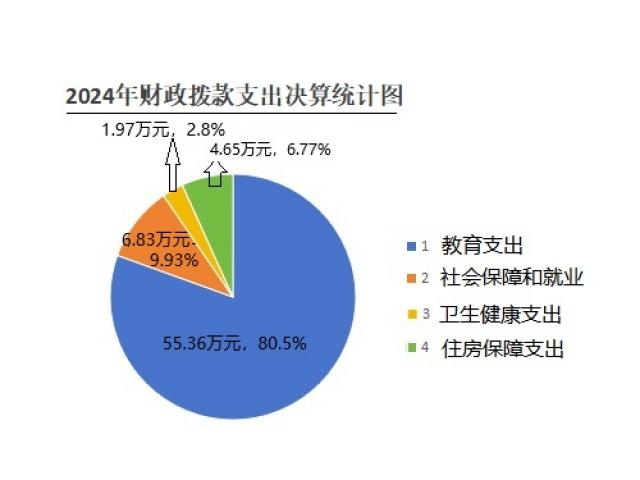2024年度一般公共预算财政拨款支出68.77万元,主要用于以下方面:教育支出55.36万元,占80.5%;社会保障和就业支出6.83万元,占9.93%;卫生健康支出1.93万元,占2.8%;住房保障支出4.65万元,占6.77%。