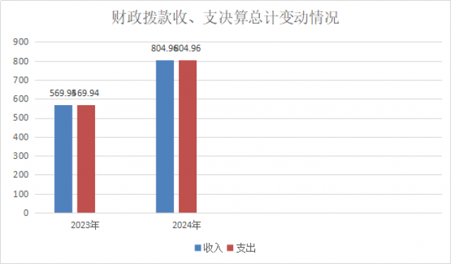 2024年度财政拨款收入、支出总计均为804.96万元。与2023年度相比,财政拨款收入总计、支出总计各增加235.02万元,增长0.41%。主要变动原因是宣汉县华融幼儿园分园的相关经费在本园。