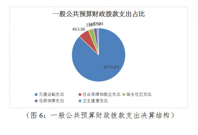 2024年度一般公共预算财政拨款支出6846.71万元,主要用于以下方面:社会保障和就业支出463.06万元,占6.8%;卫生健康支出67.04万元,占1%;住房保障支出142.92万元,占2.1%;交通运输支出6173.69万元,占90.1%;城乡社区支出238万元,占3.5%。