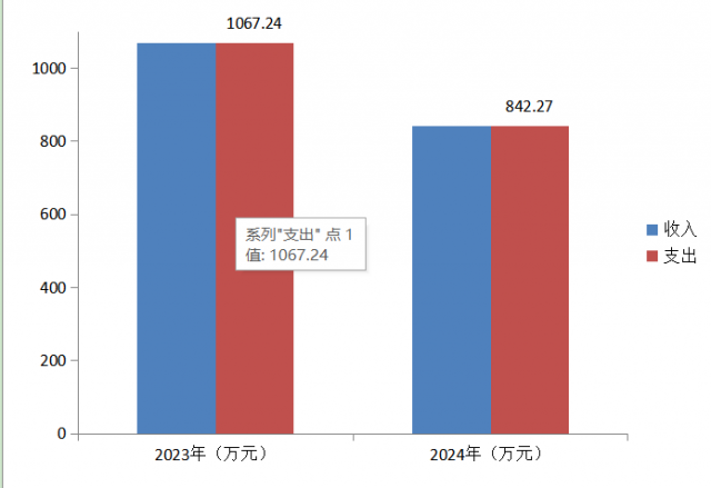 2024年度收入、支出总计均为842.27万元。与2023年度相比,收入、支出总计各减少224.97万元,下降21.08%。主要变动原因: 2024年人员支出较上年增加13.99万元,公用经费支出较上年减少117.25万元,项目支出较上年减少121.71万元。
