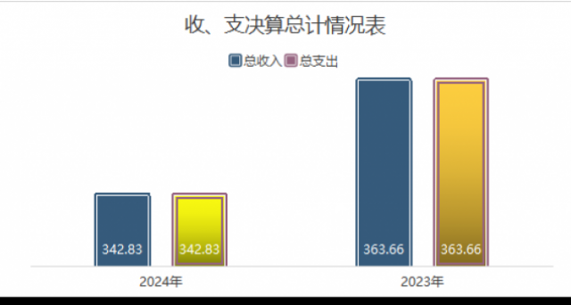 2024年度收、支总计均为342.83万元。与2023年度相比,收、支总计各减少20.83万元,下降5.73%。主要变动原因是2024年人员减少。