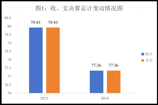 2024年度收入、支出总计均为77.36万元。与2023年度相比,收入、支出总计减少2.57万元,下降3%。主要变动原因是人员减少。
