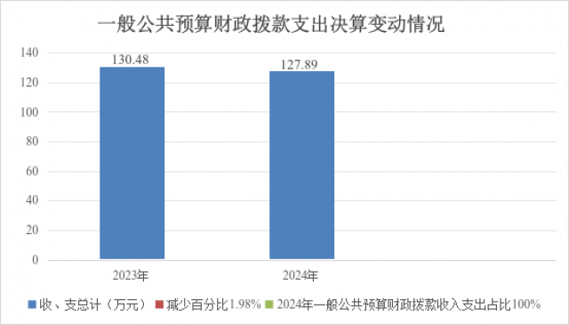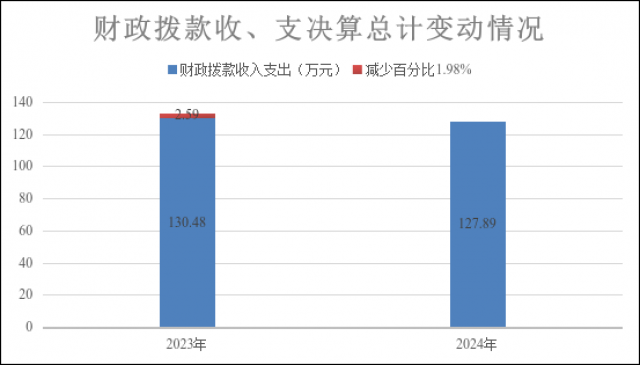 2024年度财政拨款收入、支出总计均为127.89万元。与2023年度相比,财政拨款收入总计、支出总计各减少2.59万元,下降1.98%。主要变动原因是厉行节约。