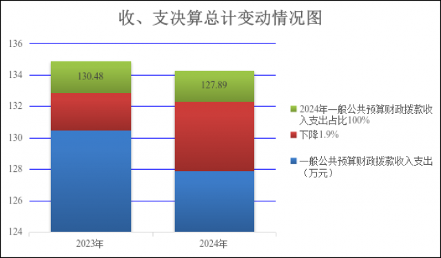 2024年度收入、支出总计均为127.89万元。与2023年度相比,收入、支出总计各减少2.59万元,下降1.98%。主要变动原因是厉行节约。