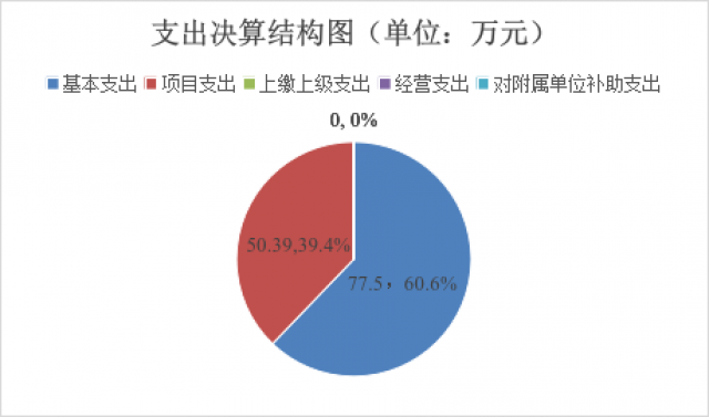 2024年度本年支出合计127.89万元,其中:基本支出77.5万元,占60.6%;项目支出50.39万元,占39.4%;上缴上级支出0万元,占0%;经营支出0万元,占0%;对附属单位补助支出0万元,占0%。