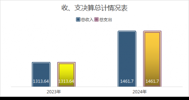 2024年度收、支总计均为1461.7万元。与2023年度相比,收、支总计各增加148.06万元,增长11.3%。主要变动原因是2024年人员及工资调整,项目支出增加。