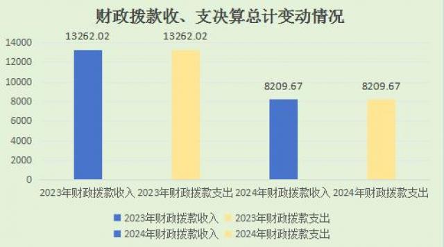 2024年度财政拨款收入、支出总计均为8209.67万元。与2023年度相比,收入、支出总计各减少5052.35万元,下降了38.1%。主要变动原因:一是本年度公共卫生服务等项目的资金由财政部门直接下达各预算单位,减少了项目预算。二是县卫生健康局本级行政单位、计划生育服务中心、原计划生育服务站在职职工在本年度内退休较多,导致社会保障和就业支出、行政事业单位医疗费等人员经费及公用经费减少。