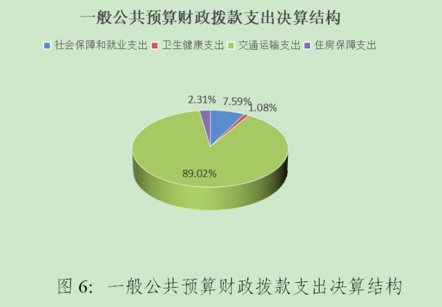 2024年度一般公共预算财政拨款支出5607.44万元,各支出占总支出的比重如下所示:社会保障和就业支出425.39万元,占7.59%;卫生健康支出60.60万元,占1.08%;交通运输支出4991.71万元,占89.02%;住房保障支出129.74万元,占2.31%。