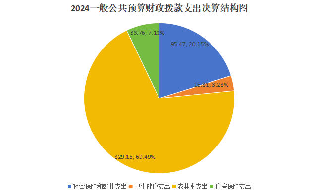 2024年度一般公共预算财政拨款支出473.69万元,主要用于以下方面:社会保障和就业支出95.47万元,占20.2%;卫生健康支出15.31万元,占3.2%;农林水支出329.15万元,占69.5%;住房保障支出33.76万元,占7.1%。