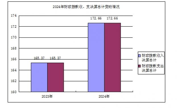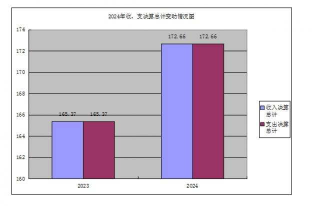 2024年度财政拨款收入、支出总计均为172.66万元。与2023年度相比,财政拨款收入总计、支出总计各增加7.29万元,增长4.4%。主要变动原因是年中职工增加1名、职工工资增加。