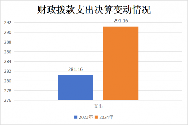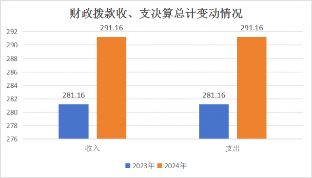 2024年度财政拨款收入、支出总计均为291.16万元。与2023年度相比,财政拨款收入总计、支出总计各增加10万元,增长3.6%。主要变动原因是退休职工增加两人,当年的职业年金缴费支出和事业单位离退休费增加。