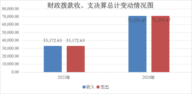 2024年度财政拨款收入总计为71,253.47万元。与2023年度相比,收入总计增加38,080.84万元,增长114.79%。主要变动的原因是2024年县城区重点市政工程建设项目的增加,项目工程开支经费增加,且政府购买服务增加,政府购买服务费增加。
