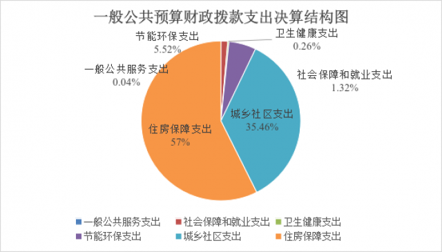 2024年度一般公共预算财政拨款支出34,726.79万元,主要用于以下方面:一般公共服务支出14万元,占0.04%;教育支出0万元,占0%;科学技术支出0万元,占0%;文化旅游体育与传媒支出0万元,占0%;社会保障和就业支出459.25万元,占1.32%;卫生健康支出90.17万元,占0.26%;节能环保支出1,916.88万元,占5.52%;城乡社区支出12,312.79万元,占35.46%;住房保障支出19,933.69万元,占57.40%。(注:仅罗列本部门涉及的全部功能分类科目,至类级)